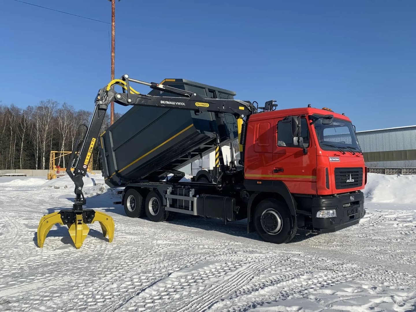 Если техники нет, требуется самозагрузка. В этом случае применяется ломовоз с гидроманипулятором и усиленным самосвальным кузовом. Машина самостоятельно производит погрузку и вывоз, что делает ее универсальным решением для разрозненных или слабо оснащенных площадок.